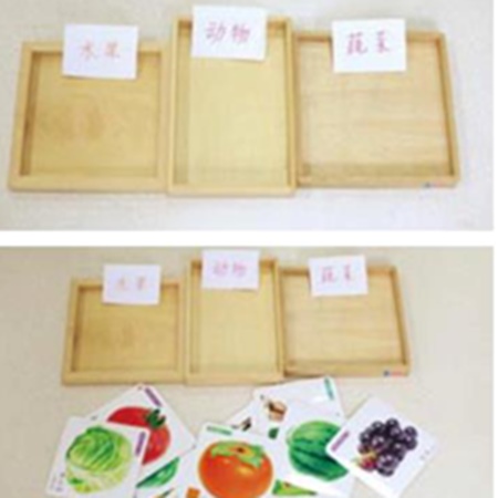 材料准备:准备一些动物、水果、蔬菜的图片,如老虎、猴子、西瓜、白菜等,三个纸盒,分别标出动物、蔬菜、水果