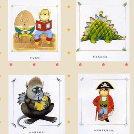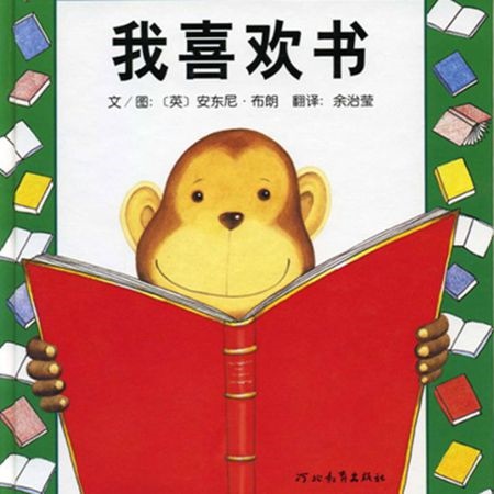 你可以像那头大怪物一样,抱着自己的宝宝一起翻?看。或者,把书页拆开甚至想办法放大,挂在宝宝房间的各个角落。当然,更为重要的是,你应当身体力行,像那只小猩猩一样读书、爱书,让你的宝宝沉浸在“书之爱”的氛围中!孩子主要的学习途径不是来自大人的言传,而是身教,因为孩子生来就是模仿的天才!安东尼?布朗选用猩猩作为这些“宣传画”的主角,大概也有这样的用意,因为猩猩也是动物中的模仿天才。