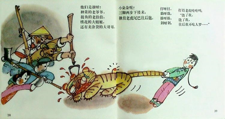 图:《老虎外婆》本身就是早年的彩色、大开本连环画,现在摇身一变成为图画书了。我一直认为这个故事中,鲁兵的儿童诗过于冗长了,对画家詹同来说是好事也是挑战:文字多可以多个角度,但又无法突破当时的“重点不突出”的窠臼