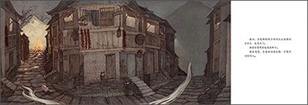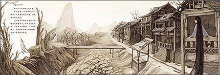图:三幅图用了中国画中的传统屏风形式;“远望”这个小山村,是一个狼头的形象。