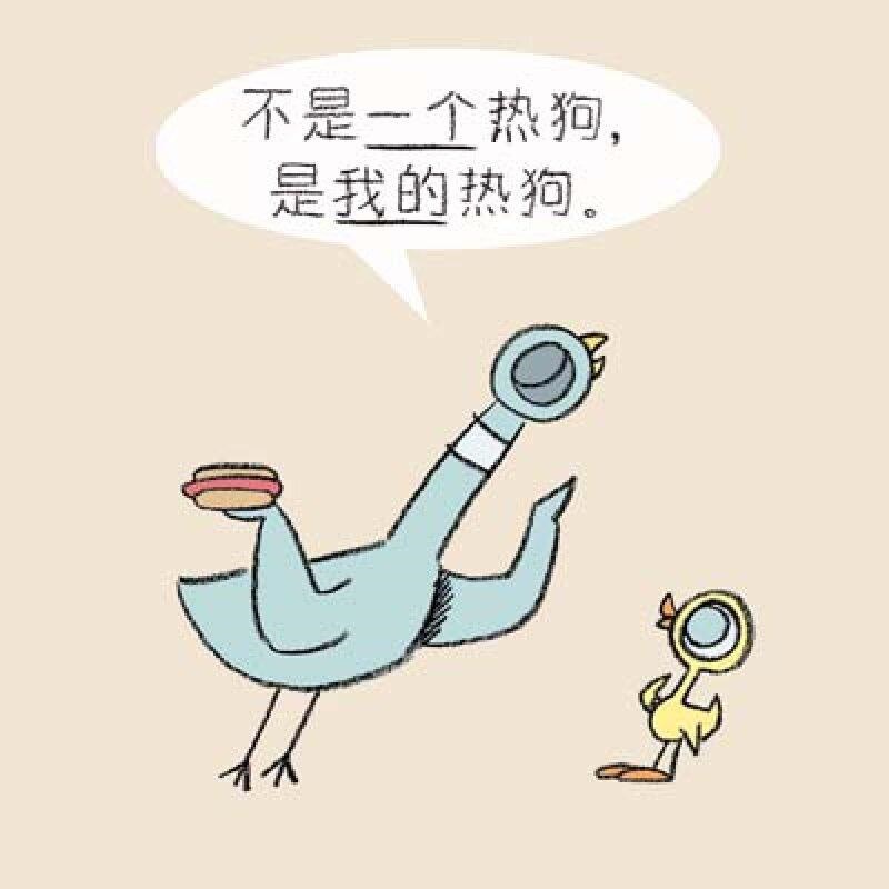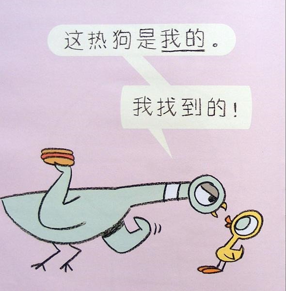《鸽子捡到了一只热狗》完全是两个角色的对话,而且鸽子和小鸡都是“我”如何如何,特别是在争夺热狗的所有权的时候,鸽子多次强调这是“我的”,这样的故事非常有助于孩子们的自我认知与第一人称表达的强化。
