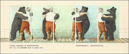 这本书故事简单,画面也是极简主义,除了能叙述故事的线条和拼贴组成的场景和角色外,没有多少复杂的画面,没有色彩斑驳之炫目。但大熊和巨人“抱在一起过桥”的那个大跨页还是很抓我们的眼球,孩子会在那里停留好一会,像是在欣赏故事之生动,又像是琢磨其中的道理。