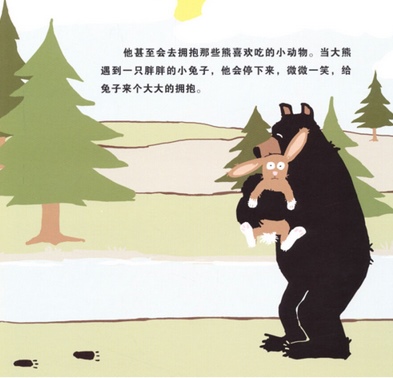 尽管很多爸爸妈妈提出抗议,一部成人视角的所谓环保动画片一直在各个电视台适合儿童看的时段里反复播放,一个叫光头强的家伙总是想着砍伐树林,而熊大熊二也是胡乱说话、崇尚暴力,要我说抓紧把电视关了,别让孩子们看了为好。省下来的时间就从来亲子共读绘本好了,就说同样主题、同样人物设定的绘本都恰好有一本----《大熊抱抱》。