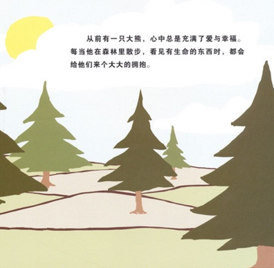 《大熊抱抱》的温暖,渗透在语言,流露于情节。通篇是妈妈和孩子都倍感亲切的语言——拥抱,这是宝贝对爱的渴望和感知,也是妈妈对宝贝爱的流露和表达。拥抱意味着关爱、信任、共存和温暖,所以妈妈和宝宝相拥共读时,不经意间就会更加亲近。书中的大熊,用拥抱爱着周围的一切,他拥抱所有的存在,大的、小的、高的、矮的、香香的、臭臭的、迷人的、恐怖的。他最爱的是树,每棵树他都爱,所以他拥抱每棵树,大树、小树、苹果树、梨树、桃树……直到有一天,他看到一个拿着斧头砍树的男人,大熊又害怕又难过,第一次不想拥抱,甚至想狠狠地咬这个男人,但他决定做一件最棒的事:给这个男人一个抱抱……享受故事的我们真切地感知到大熊的有义,拥抱一切,甚至拥抱了他不想拥抱的人,用宽容温暖的姿势与所有存在一起分享他的爱;我们感知到树木的有情,那棵被砍伤的大树一定很疼吧,我们也想像大熊一样张开双臂给他抚慰,因为大树也会从拥抱中“觉得好多了”,就像受挫的我们渴望从妈妈的怀中得到温暖的慰藉。
