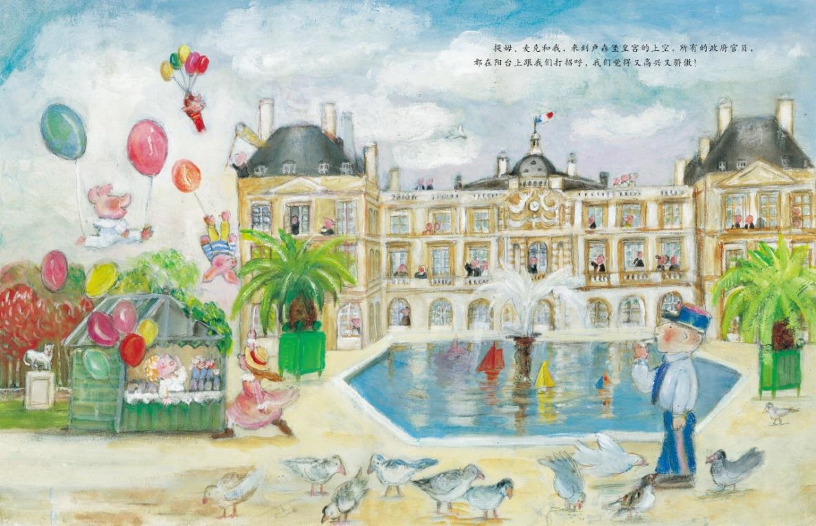 书中,调皮的小猪查尔斯写信告诉爸爸妈妈他和两位表哥在卢森堡公园一起玩的状况,把自己说得非常老实听话,没淘气没作乱。可是,事实上,信里的乖宝宝在公园里闹翻了天……这种通过信件的方式,让文字与图画(现实)脱离,真正体现了图文变奏的特色和功底。再加上我喜爱的法国大使安德烈·德昂的慧心巧思,把平凡的题材发挥得别出心裁,一个个荒诞的画面、一个个离谱的故事,跃然纸上,营造出轻松欢愉的气氛,让同样内心澎湃的孩子们读来倍感亲切!