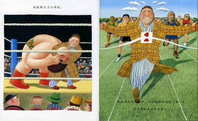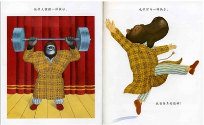 安东尼?布朗的图画向来喜欢暗藏玄机,借着隐藏的图像影射复杂的心理变化。不过这本书显然是设计给较为年幼的读者,图像的表现比较单纯,鲜有深层的暗示,尽管如此,图画?中还是添加了许多有趣的细节,例如,藏在树林里的小红帽和三只小猪、椅子露出的马脚、稀疏得像梳子的头发、球形的云和树、三大男高音中的帕瓦罗蒂和多明戈……?其中描写爸爸跳过月亮的跨页,更结合了一首《鹅妈妈童谣》(Hey, diddle, diddle)的情节,童谣里说:“嘿!滴兜,滴兜,猫咪伴着小提琴,母牛跳过月亮;看到这么好玩的事儿,小狗笑了,盘子也跟着汤匙跑了!”图画里爸爸跳过了月亮,童谣里的母牛没有出现,母牛的斑纹倒是跑到狗身上去了,长了腿的盘子盛着汤匙跑出画面。除了单页图画上出现的趣味外,两两相对的页面,也呼应着爸爸性格中的刚强与柔软、聪明与笨拙……种种相对的特质,把爸爸刻画得极富人性、可爱又逗趣。