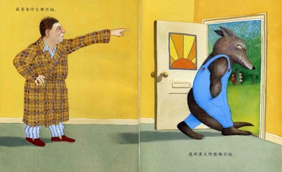 往后翻,是一个跨页,“他什么都不怕,连坏蛋大野狼都不怕”,爸爸叉着腰,大野狼正灰溜溜地往外走,门上的太阳呼应了前面墙上的太阳。再仔细一看,躲在门外树背后的是小红帽和三只小猪,呵,他们可是最怕大野狼的呀!“我”爸爸是如此地孔武有力,无所畏惧。再想一想,为什么作者要用大野狼来进行对比呢?首先因为它是孩子们熟悉的动物,更深层的原因是,能打败大野狼的爸爸可以提供给孩子安全的保障——不管是在身体上,还是心理上。