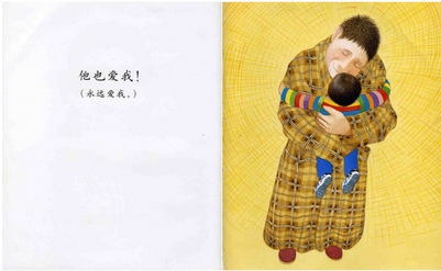爸爸就一直这样被比喻来比喻去,直到最后,“我爱我爸爸,而且你知道吗”,一双孩子手伸在爸爸的胸前,小太阳又出现在爸爸的睡衣纽扣上,爸爸露出慈祥的笑容和温柔的目光。再翻?到最后,“他也爱我。(永远爱我)”,爸爸把“我”紧紧地搂在怀里,背景是凸显“永远”的年轮或时光隧道。当读者沉浸在比喻的乐趣中时,作品突然机锋一转,变成了情感的倾诉,相信很多的读者在此时都会眼泪盈眶,破“笑”为“涕”。
