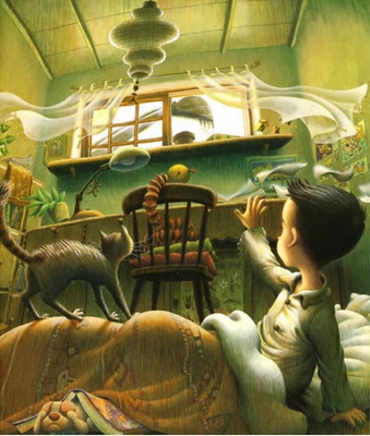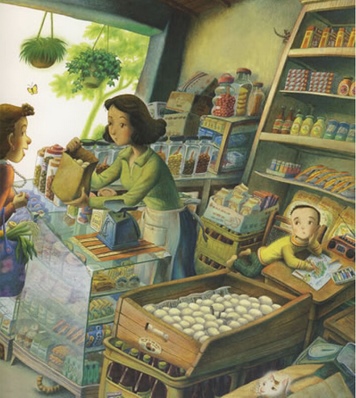 《再见小树林》延续了画家一贯细腻华丽的表现手法,真实与幻象交错,空间、视角都极具冲击力,画面布局井井有条,充满灵性的细节更彰显了一位画家的成熟。故事开始有一个壮阔的俯视场景,这个画面的主体仍然是一大片绿色,这是他作品的长项,我们可以在里面找到各有考究丰富多样的植物,各种形态的叶子错落有致,笔法则虚实相间变化多端,有的精细勾勒,有的轻松点缀,有的舒缓渲染,各有章法,展现出繁茂的生命力。画面四周辅助一片城市景象,既是辅助就不能如主体的树木咄咄逼人,但同样妙趣横生,画家有意识地设置了诸多细节:结构各异的棚屋小楼、不同款式的阳窗、斑驳的板墙、爬上植物的人行天桥、墙头跳跃的野猫,层次分明,虽然我们没有去过当年的台北,却依然看到了一个熟悉的城市生态。故事后面描绘的杂货店同样如此,整个构图被塞得满满当当,但画家用空间分割把细节组合得井然有序,我们可以安心地看见琳琅满目的商品、墙角高垒的纸盒、拥挤的玻璃货柜、堆叠的啤酒和鸭蛋、檐下垂吊的植物,甚至可以从中看到自己童年巷口的小店,看到邻居大妈亲热的笑脸。也许是看腻了图画书中那些遥远的欧洲小镇、美洲森林,面对画家精心安排的如此场景很容易有种别样的感动,它可以打开我们的记忆大门,散发出同样文化浸润下亲切悠长的气息。于是单纯的造型和细节有了特别的意韵,也许是一种历史的文化意韵,这或许是华人原创作品于我们最大的宝贵之一。