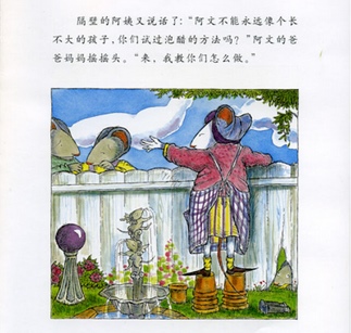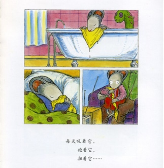 另外,住在隔壁的阿姨也是重要的角色,她在封面出现,斜眼望着阿文和他的小毯子,之后,正是她挑起了“毯子”事件。这位阿姨有一副望远镜,她不但喜欢窥探别人的生活,也喜欢站得高高的,摆出指导者的姿态,可惜她给阿文父母的建议实在不太高明。在有着老鼠喷泉的那个画面里,亨克斯借着四个角色所站的位置、姿态和表情,巧妙地呈现出彼此的关系。