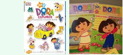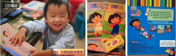 特别是有些英语学习材料是图书、音像、玩具都有的。比如,《Dora》我们已经重复看了好几遍DVD了,书也看了不少了,还有纸板游戏、小贴画呢。