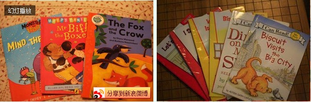 这些翻翻书虽然有识物试听的功能,很快地孩子就能够自己翻读了。我们就可以开始阅读有故事情节的英文书了。我们选择的包括经典故事,如《The Fox and the Crow》、“彼得兔系列”,也有系列的知名绘本,如“I can read!”中的“Biscuit”系列,还有很多同级别的单本绘本,比如《Ten little fingers》。