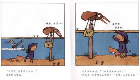 而《鲸鱼》整体的画风则是抓住这种纯真的出色操作:以湖蓝色为主色调的底色给人纯净清爽的感觉;朴拙甚至夸张的线条和造型,更是童趣盎然;画幅镶嵌的方框,让全书简洁明快的特色非常突出;一些具体象征意象和表现手法的使用,比如书和书包的象征性,对候鸟声音由远及近的刻绘,都具有明晰直接的特点,等等。正是由这些具体琐碎的细节,渐渐累积起来了全书纯净亲切的主导风格。