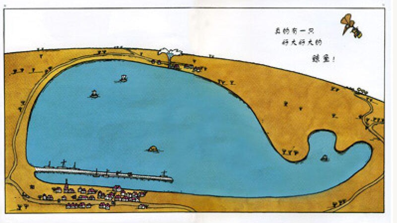 当然要说到五味太郎的设计感。《鲸鱼》最大的设计在于:鲸鱼只是一个图案,而湖畔村的渔民却想当然地以为那是一具可供他们鱼肉的生命。这不但构成了故事的整体骨架,而且确定了由局部到全体的发展趋势。虽然在发现的过程中,那些单独的部件比如烟柱、湖中小岛和湖边的抽水站等等,显得繁杂,但是当谜底揭开,就会发现,其实不过是个简单自然的认识过程。
