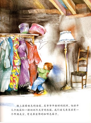 如果说,《爷爷有没有穿西装》是一首充满追思的安魂曲,让我们看到生命如何在血脉中延续;《爷爷总有办法》是生活气息浓厚的二重奏,让我们感受人生的细小变化与快乐;《我爱我的爷爷》是一部朴实无华的纪录片,把人与人的心灵交流铺展于我们眼前;那么,《歌舞爷爷》又是一个怎样的故事呢?只看这本书的图画,会令人错以为,这是一个老人和几个孩子的欢快嬉戏,而看到文字,你才会明白,这是一个穿越时空的奇妙歌舞剧。