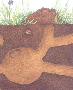 翻开书,这只名叫嘉宝的小鼹鼠的形象令人印象深刻,精细写实的画风可以让小读者清楚地了解他的外表特征。画家有时还赋予小鼹鼠丰富的拟人化的表现——比如那根探测标杆猛戳到地下时,他那惊慌失措的表情。很多画面采用了跨页,展示了鼹鼠地下生活的各种细节。尤其是横截面的构图,使地面上下同时进行的情节发展一目了然。故事中,建筑机械的庞大和小鼹鼠身体的弱小对比,也产生了很强烈的震撼效果。