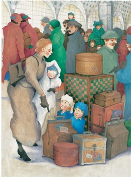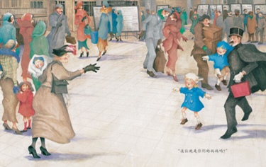 再翻回头来看看古德为这个故事设计的场景——巴黎火车站,全书共有三个跨页来表现火车站内的全景。众多的“群众”角色在这一场景里出现:南来北往的乘客,形形色色的人物,每个人都围绕着故事的发展被刻画得细致入微。尤其是人群中出现的孩子们,无一不灵动活泼,在画面中起到了与姐弟俩相互呼应的点睛作用。
