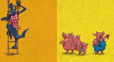 这个故事的改编还不出狼捉猪的既定模式,还有一本让人看了会糊涂的《三只小猪的真实故事》,从大灰狼的角度来阐释“人人都知道”的狼吃了三只小猪的“事实”,而且引入了现代的司法体系、传媒体系,给了狼这个传统意义上的凶手一个自我辩白的机会,孩子们会信吗?