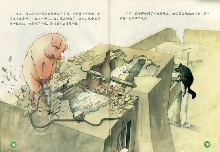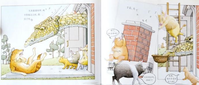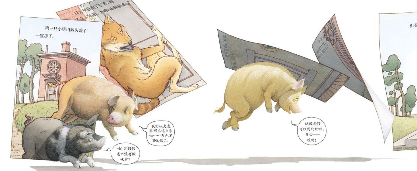 这个版本的三只小猪故事是最难理解的,我女儿读了一遍又一遍,我看也只是乐在其中,而不是思考的乐趣。我们不妨再退一步,看看三只小猪还能搞出什么花样?