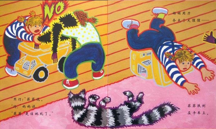 图:《菲菲生气了》的线条变红了,越来越生气了;猫和玩偶的锯齿线条也积攒愤怒