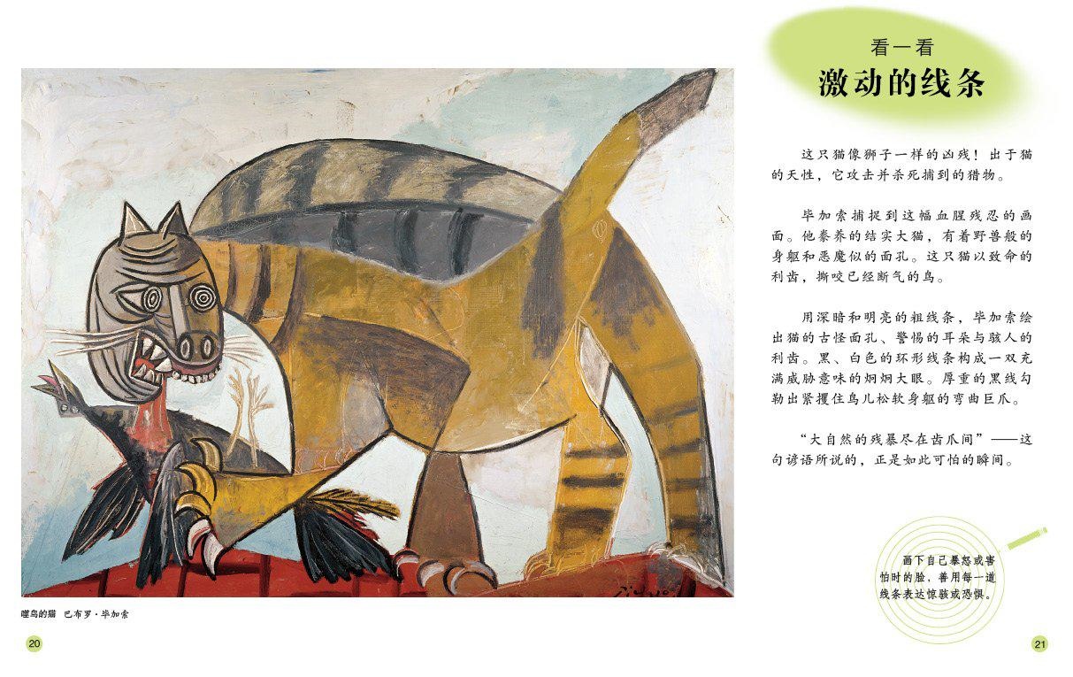 在图画书的图画中,尽管在书中起到说故事的作用,但首先是一幅画,一幅构图严谨、色调恰到好处,光影和笔触都经过推敲的画,而线条在其中发挥着重要的作用。就像一本艺术欣赏绘本的名义一样----
