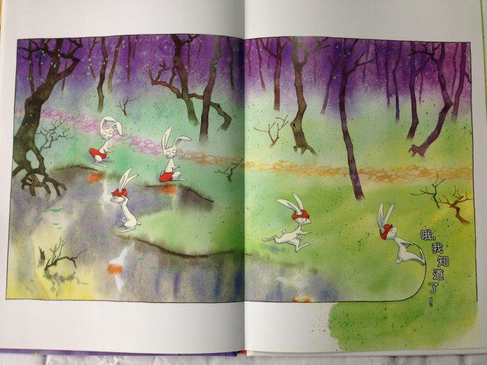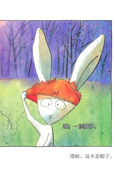 图:线条之外一直有个声音在说话:“错啦,这不是帽子。”右:兔子把线条拉起来,整个画面融合了。