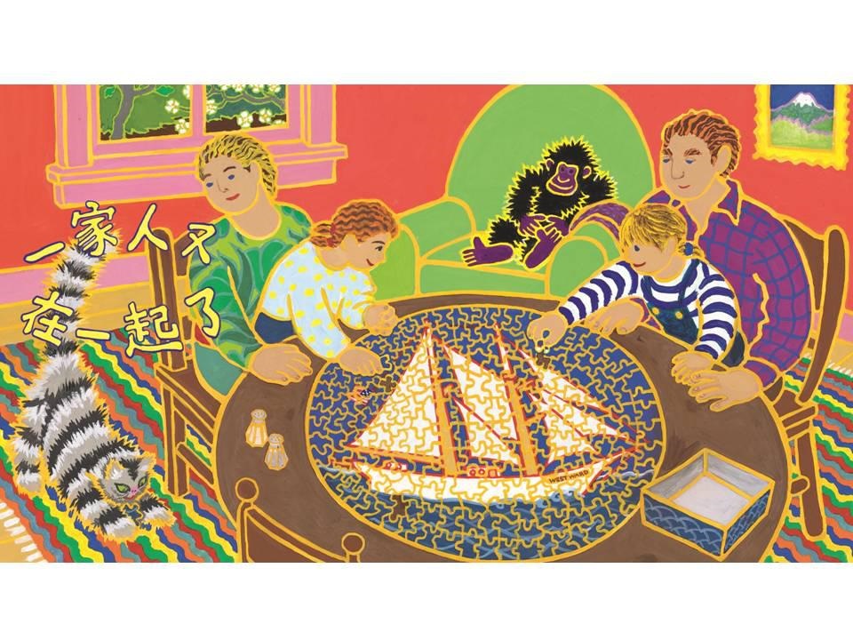 图:《菲菲生气了》故事的最后,全家和好了,不仅线条的颜色变得和谐了,画面中也多了曲线,甚至是圆弧---预示着风平浪静了。猫和玩偶的锯齿线条也变得可爱了。