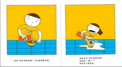 我家葫芦哥哥和妹妹相差不到三岁,很多情况跟书里说的一样。最逗的是就跟书上“尿尿”那章一样,几乎每天他们已经在卧室睡觉了,我在客厅,总是看到哥哥先出来,妹妹接着出来,“hi,尿花花”。其时妹妹都已经骑上了尿不湿,她也要给解开,爬上马桶方便方便。