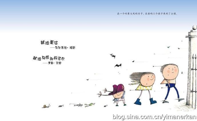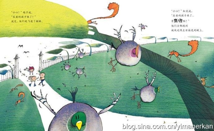 是啊,开篇第一句说的就是“在一个刮着大风的日子”,所以,画面上能动的一切——树,不仅是树叶,还有树干,孩子们的头发,都酷酷地随风飞舞着。儿子接着说:“风从右边吹来的。”儿童读图与他们自身的成长程度相关,不同年龄的孩童看到的形象各有不同,他们用他们的眼睛在给世界造型。