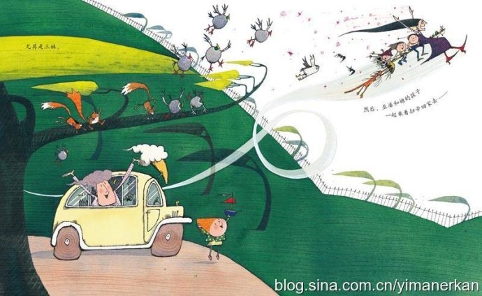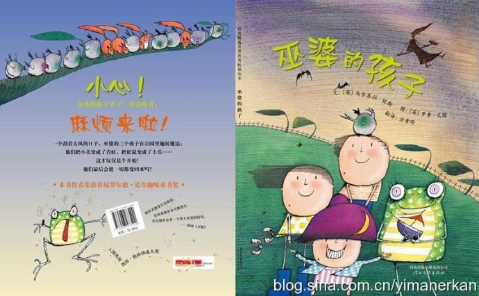 所以,孩子们总能比我们先感受到阅读图的快乐。当《巫婆的孩子》摆在我的面前时,我还没有打开书,小人儿已经嚷嚷起来了:好大的风啊,树都弯成那样了。