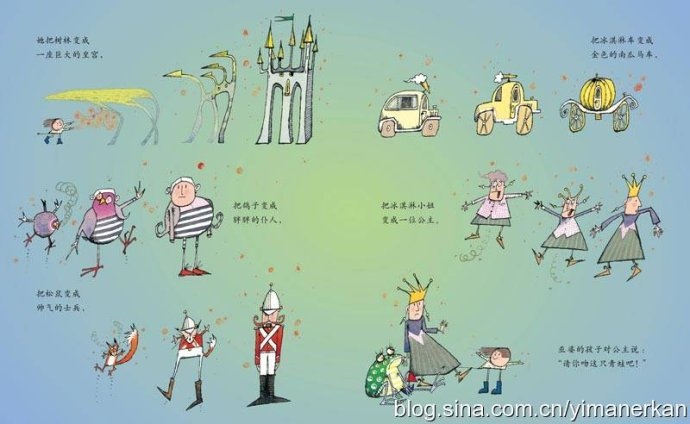 《巫婆的孩子》的画风特别适合四岁多到七八岁的孩子看,在他们的眼睛里,人都是大大的脑袋,方形或者圆形或者三角形或者梯形的身体,细细长长的四肢,这些也往往反映到孩子们的画里。在这本书中孩子们总能找到其中熟悉的造型,比如,我儿子对“青蛙王子”的帆船很有好感,因为“这个船跟我画的一模一样”。