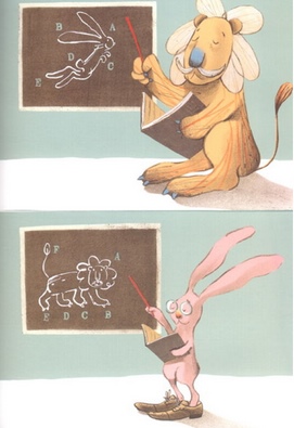 这么多的两两相交,我们读起来,就有了变化的可能。你可以是“一条筋读法”,先读狮子的故事知道结束;也可以是“分分合合法”,读到狮子要进山洞就停住,反回去读兔子的故事,同样读到山洞口,让阿迪和茱莉的故事合体后,在分开读狮子和兔子的故事;更可以是“齐头并进法”,读一页狮子,读一页兔子,反反复复读到底。我们还可以“角色错乱法”,爸爸和孩子读狮子的故事,妈妈和孩子读兔子的故事。