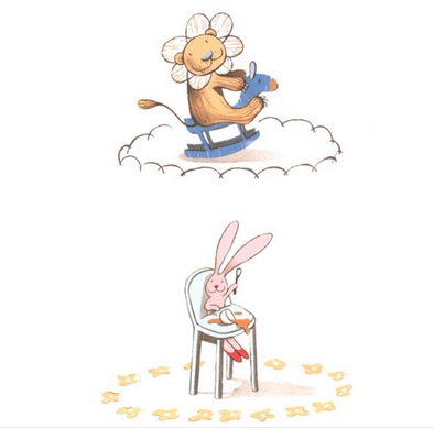 这还是个买一赠一的图画书,从第一页开始,每一页都一分为二,上面是小狮子阿迪的故事,下面是小兔子茱莉的故事,到了第21页(书上可没有页数,你要自己数啊)才合二为一,而此时,阿迪和茱莉都往一个山洞去躲雨。接下来的10页里,阿迪和茱莉认识了,一起玩耍,直到天黑各自回家,又是分成两页,各自演绎在自己家里的故事。过去,我们听评书,“花开两朵,各表一枝”,在《阿迪和茱莉》中,我们却是可以同步地读到阿迪和茱莉的不同故事。当然,这其中的又是那样的接近。