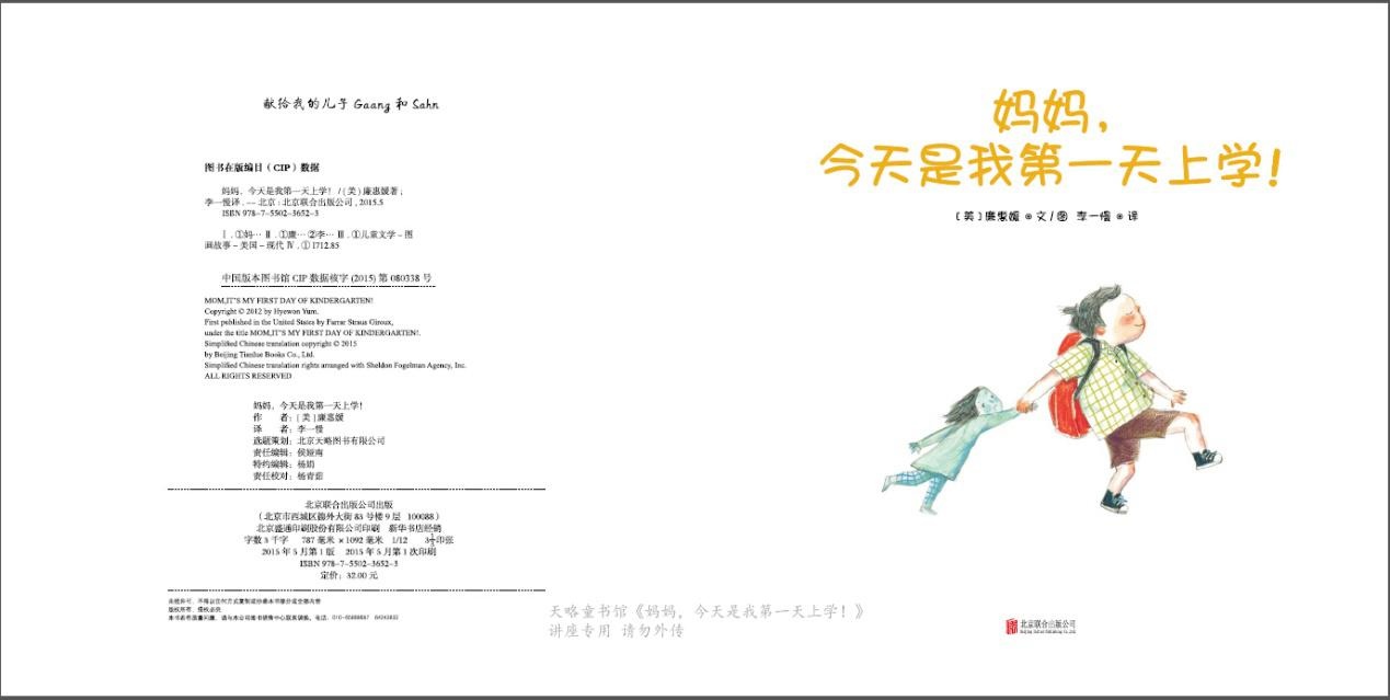 这本书版权页和书名页算是中规中矩,也是最常见的布局和图文搭配。当然,这幅插图作者做了精心的设计:画面右边大大的,分明是小男孩,一脸开心。后面被他拽着的那个是谁呢?小小的,比小男孩要小很多,全身上下还泛着淡淡的蓝色。