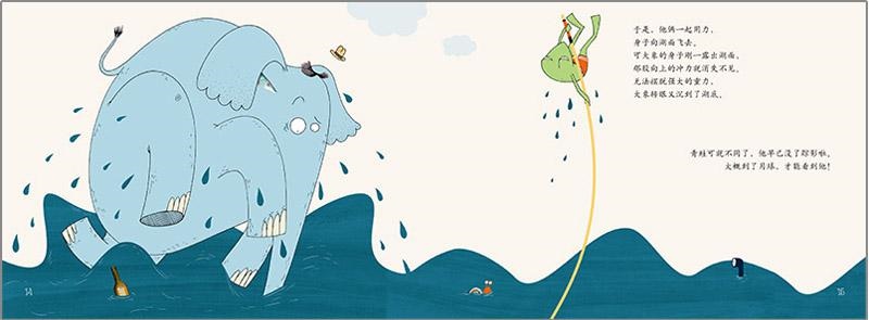 停顿通常是为了制造紧张情绪和悬疑的气氛,为后续故事的高潮铺陈,或者是告诉孩子要扭转乾坤了,而有时候停顿是为了给孩子看图的时间,更厉害的停顿就是为了引发孩子的思考。这本书开头的“可是一不小心……”就可以停顿时间稍长一些,让孩子带着疑问、通过读图去猜测故事的发展;在每一个情节之间也可以略微停顿,给孩子回味的余地;“大象出水”的那个场景里,“突然,他感到整个身子都被提了起来……”此处也很适合停顿,制造紧张的气氛,也让孩子们充分地去读图。