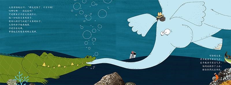 我曾经有个观点,对于低幼儿童的亲子共读来说,图x文x声音的三重奏才是图画书的模范---一本好书图文节奏再好,也要靠我们讲读给孩子。要让幼儿喜欢一本书,我们可以这样利用好声音:停顿和留白、声音响亮或轻柔、速度快或慢、音调高或低。比如,鳄鱼在施展他的救援大法的时候,“大象害怕地大叫:“不要!放——咕咚咕咚——放过我吧!”可是鳄鱼不容他分说,就一口咬住了软软的象鼻子,使足了劲将空气吹进了他的喉咙里。”我们在给孩子共读前的预习中,要注意到故事的文本和图画中,已经明白告诉我们该选择那一种声音来表达了,或许不同的人高兴的情绪和表情、语调各有不同,可是“害怕的大叫”估计大致相同,“放开我吧”的断断续续中,夹杂着大象因喝水发出的“咕咚咕咚”声,“不容分说”又告诉我们速度的快慢……只要注意到其中的声音变化,我看不要什么专业训练,就能让这个故事的讲述更加得分。