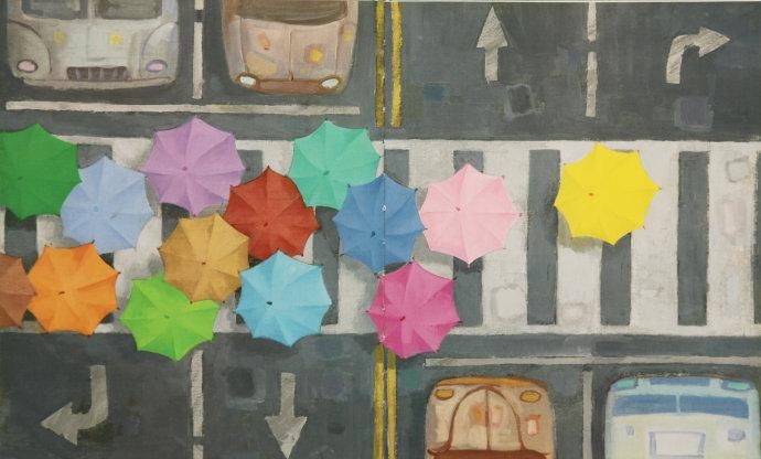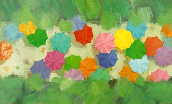 我们见多了不动的图画,无声的图画,而《黄雨伞》则让图画动起来,让图画有了声音。在图画里,艺术家书中采用的俯瞰的角度,使得我们在阅读时有了时间维度,还有被雨伞引导的行进方向。在图画里,我们看到的静止图像,每一幅却都是从无到有的流动进来,空间维度得以融入时间维度。空间和时间互相结合得如此完美,以至于来自视觉与听觉的、在空间与时间上的体验达到近乎水乳交融的地步。雨伞一个一个地加入,连成一串、融成一片,不同的颜色恰好可以代表声音的高低和强弱,孩子们的眼睛和耳朵都在有规律地吸收着---分不清主次。音乐通过丰富的图像呈现出来。