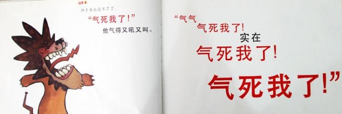 有的字的颜色会根据文字内容而改变,有的用红色来突出,比如上图《臭起司小子爆笑故事集》中的红字,有的用红色来标示情绪,比如《不会写字的狮子》中,狮子生气时候说出红色的字来,并且用字号大小的变化来表明情绪的变化。