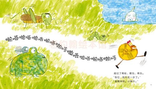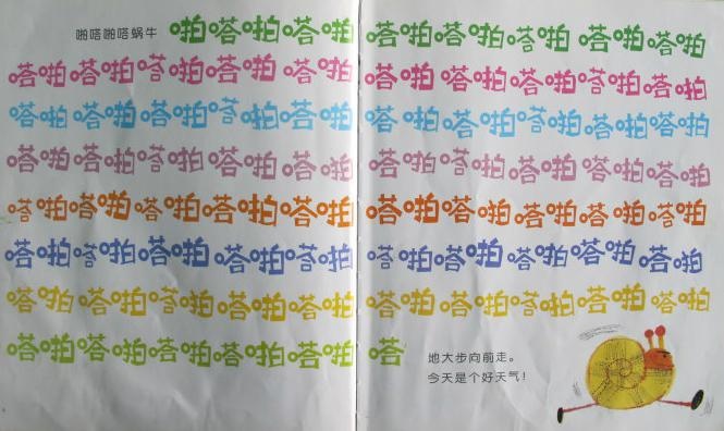 文字在排版上的变化也能让图文故事变出新意。《啪嗒啪嗒蜗牛》就是一本很好的例子,文字本身成了故事的重要支柱。